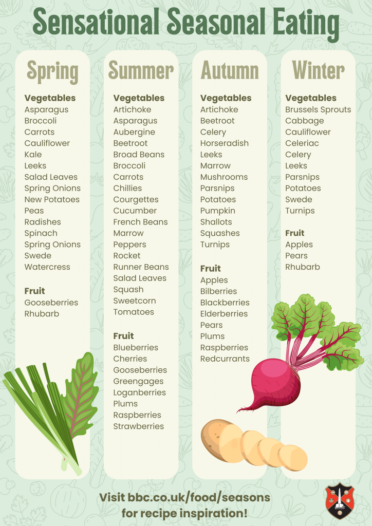 Sensational Seasonal Eating. Spring. Vegetables Asparagus Broccoli Carrots Cauliflower Kale Leeks Salad Leaves Spring Onions New Potatoes Peas Radishes Spinach Spring Onions Swede Watercress Fruit Gooseberries Rhubarb. Summer. Vegetables Artichoke Asparagus Aubergine Beetroot Broad Beans Broccoli Carrots Chillies Courgettes Cucumber French Beans Marrow Peppers Rocket Runner Beans Salad Leaves Squash Sweetcorn Tomatoes Fruit Blueberries Cherries Gooseberries Greengages Loganberries Plums Raspberries Strawberries. Autumn. Vegetables Artichoke Beetroot Celery Horseradish Leeks Marrow Mushrooms Parsnips Potatoes Pumpkin Shallots Squashes Turnips Fruit Apples Bilberries Blackberries Elderberries Pears Plums Raspberries Redcurrants. Winter. Vegetables Brussels Sprouts Cabbage Cauliflower Celeriac Celery Leeks Parsnips Potatoes Swede Turnips Fruit Apples Pears Rhubarb