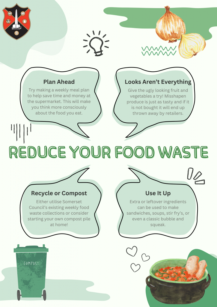 Food waste should always be responsibly disposed of and not thrown into landfill with regular refuse. When food ends up in landfill it is starved of air and the anaerobic bacteria that break it down produce methane, a greenhouse gas that is more potent carbon dioxide. In Wellington we are lucky to have weekly recycling collections, including food waste. To see when your collection dates are or to request new containers, please check Somerset Council’s dedicated webpage.