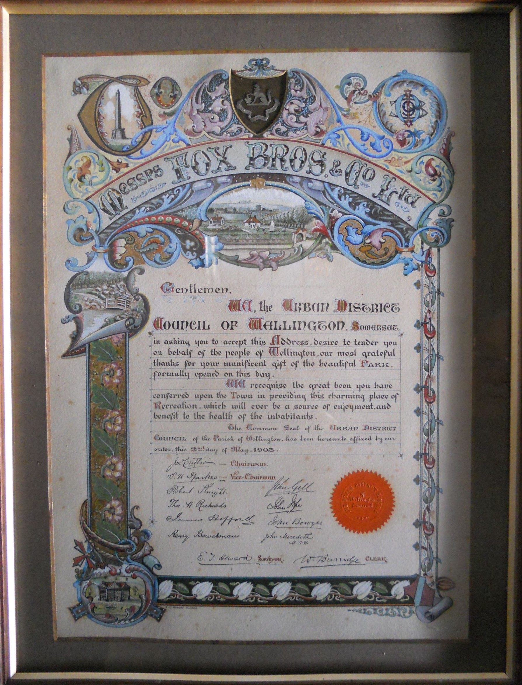 But at the following meeting of the Coronation Sub-committee, on 20th March 1902, a letter from Wellingtons’ largest manufacturing company, Fox Bros. and Co. Ltd was read out, and they agreed to create and gift the park to the town of Wellington.