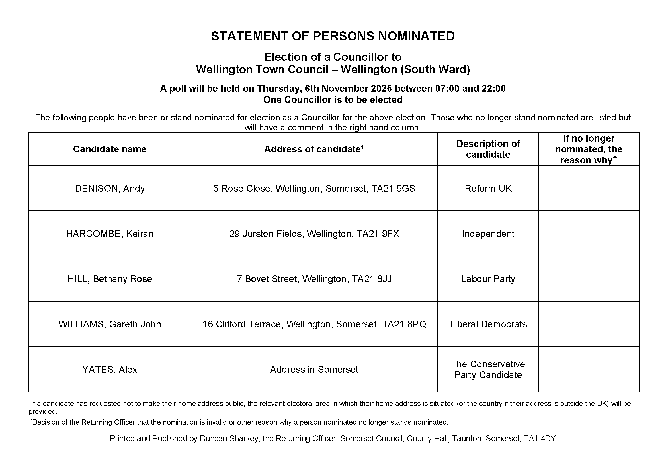 10 Oct South Ward By-Election Posted at 16:28h in News by Rebecca Hunt 0 Comments 0 Likes We have received confirmation from Somerset Council that the following candidates have been nominated in the by-election for the South Ward of Wellington. The poll will take place on 6th November.